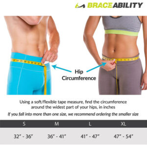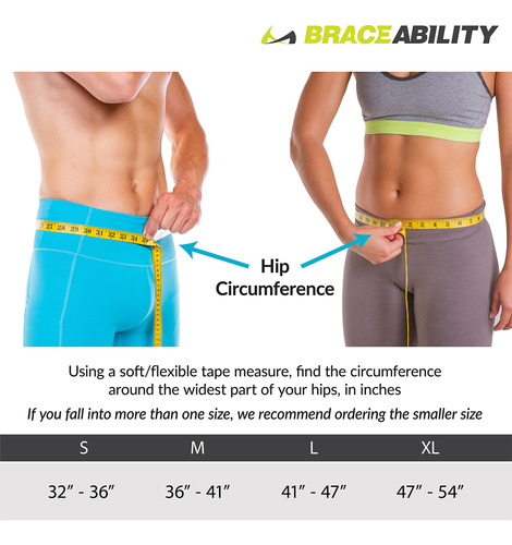 PARA ESCOLHER SEU TAMANHO — Usando uma fita métrica macia/flexível, encontre a circunferência ao redor dos quadris, em polegadas. Este cinto de hérnia inguinal acomoda circunferências do quadril de até 54 polegadas. Consulte a tabela de tamanhos ilustrada acima para descobrir seu tamanho.