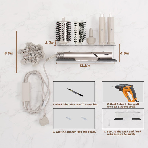 Cor: transparente Tamanho: 12,2 polegadas* 4,5* Peso: 0 kg O pacote inclui: 1 * Suporte de armazenamento compatível com o secador de cabelo Dyson Nota: a cor real do item pode ser ligeiramente diferente da cor mostrada nas fotos devido ao desempenho diferente da tela do computador e ao efeito de luz. – Suporte multifuncional para montagem na parede – Feito de acrílico, leve, compatível com o sistema de modelagem e secagem Shark FlexStyle, pode conter um conjunto completo de acessórios – Armazene 5 acessórios – 5 slots precisos para guardar todos os seus modeladores, pincéis e bicos, um slot especial segura o difusor compatível com difusor com FlexStyle. – Almofadas de silicone – As capas de silicone protegem o modelador FlexStyle de arranhões e deslizamentos. – Gancho para pendurar os cabos de alimentação com cuidado, mantendo seu conjunto de ferramentas de cabelo arrumado. – Fácil de instalar O suporte mede 12,2 “L x 3,3" H (o gancho tem 5,5" H). A embalagem vem com parafusos. Observe que este item é apenas um suporte e não contém mais nada, conforme mostrado na imagem.
