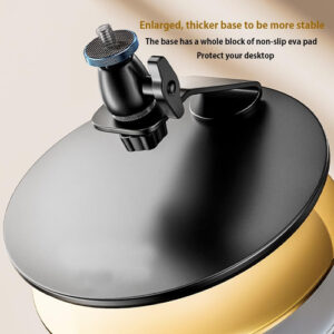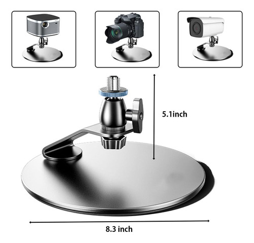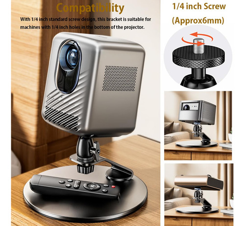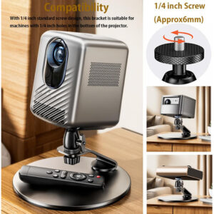Este suporte de projetor é equipado com um parafuso padrão de 1/4 de polegada que garante compatibilidade com uma ampla variedade de projetores, incluindo marcas populares como Anker NEBULA, XGIMI, JMGO e muitas outras. – Suporte de projetor versátil: a base do projetor de mesa 21 cm maior de diâmetro e altura 13 cm, estabilidade estrutural, capacidade de carga 11,02 lb/5 kg A base estável possui uma almofada de silicone antiderrapante, garantindo uma configuração segura e estável, protegendo seu desktop. – Configuração fácil e ângulos de visão ajustáveis: sem necessidade de instalação na parede ou no teto, este projetor o suporte é incrivelmente fácil de usar. Sua rotação de 360 graus permite que você ajuste facilmente o ângulo de visão, garantindo a experiência de projeção perfeita. – Qualidade premium e design elegante: feito de material de liga forte e durável, este suporte oferece confiabilidade e longevidade. A parte inferior do suporte oferece espaço para armazenar o controle remoto ou outros acessórios pequenos, agregando conveniência e organização. Seu design elegante o torna adequado para várias configurações. – Compatibilidade com vários dispositivos: não limitado a miniprojetores de vídeo, este suporte também é adequado para câmeras e smartphones, tornando-o ideal para gravação de fotos e vídeos em baixo ângulo. Sua versatilidade atende a diferentes necessidades e ocasiões. – Fácil de instalar: certifique-se de que seu projetor tenha um orifício de parafuso de 1/4 na parte inferior antes de comprar este suporte de mesa para projetor. Com seu design portátil, este suporte de projetor pode ser configurado em apenas alguns minutos. Se você encontrar algum problema ao usar o produto, sinta-se à vontade para entrar em contato conosco para obter assistência.