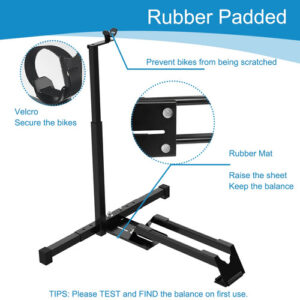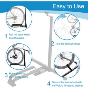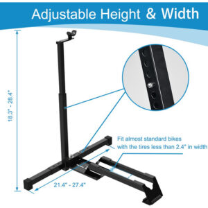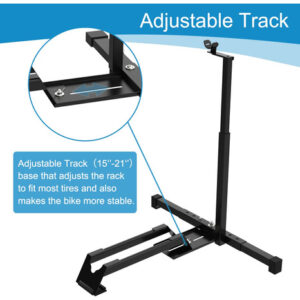 EASY TO USE UPRIGHT DESIGN PREVENTS BIKES FROM DAMAGING. – Indoor Bike Rack Vertical: The Vertical cycling floor stand is designed to store a bike in your living room, bedroom or garage, suitable for most bikes with the tires less than 2.4 in width. PDF instructions included. – Upgrade Adjustable Track: Track(15-21) base that adjusts the rack to fit most tires and also makes the bike more stable. – Adjustable Height & Width: The height of the bike stand is 18.3-28.4. Adapts to different heights of mountain bikes, road bikes, racers, children s bicycles, beach bikes. – Floor Space Saving: Saving more valuable space and save floor space, great solution for limited indoor space, can be stored in corridors, balconies, warehouses, tool rooms or other places. – Easy Assembly: Dont need drilling, no damaging walls or ceilings. Sturdy steel with powder coated finish, no scratching bicycles. Screws and anchors included, store your bicycle quickly and easily.