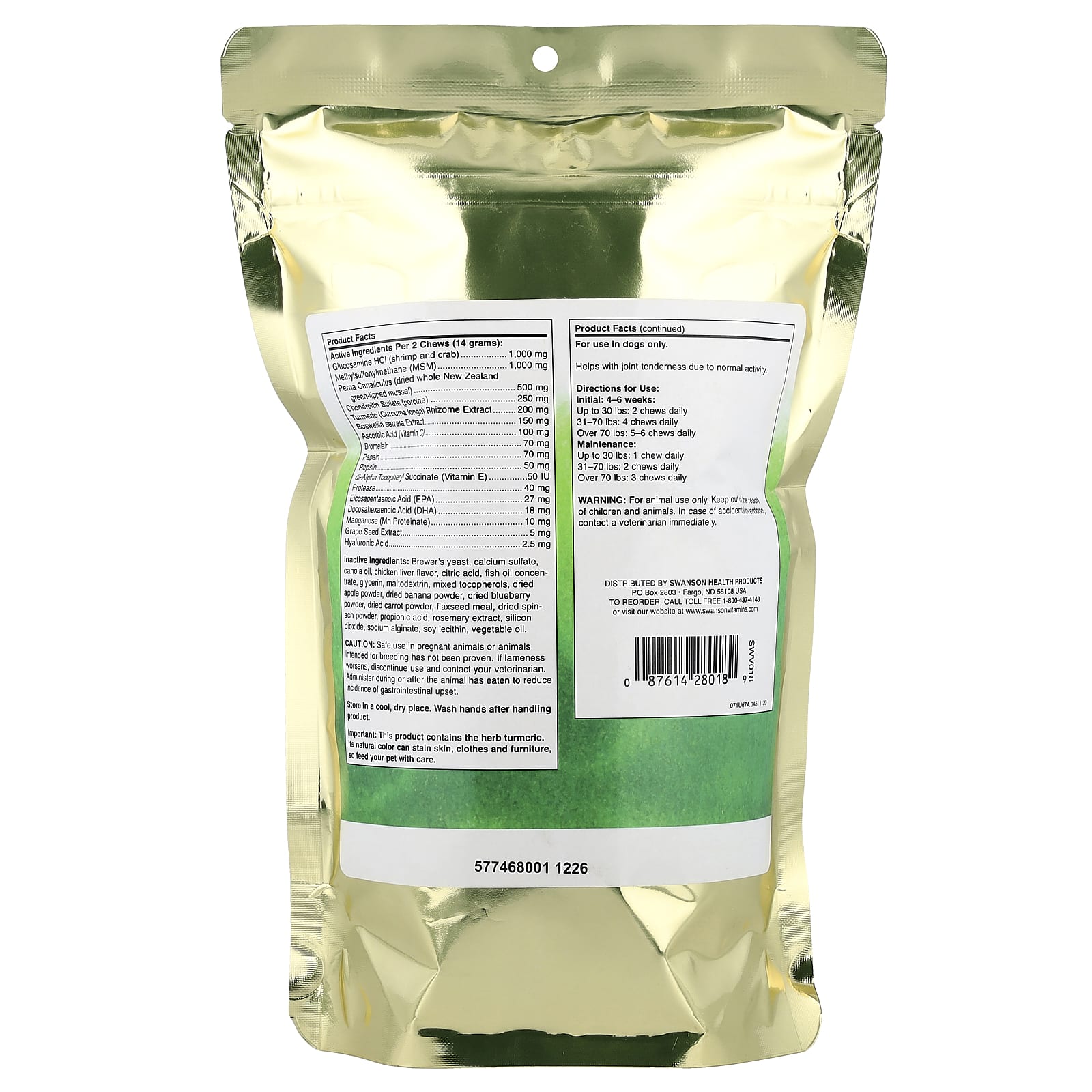 Advanced Hip & Joint for Dogs da Swanson Pet Nutrition combina nutrientes do tecido articular como glucosamina, condroitina, MSM, mexilhão de lábios verdes e ácido hialurônico com ácidos graxos ômega-3, antioxidantes, enzimas e ervas para a saúde das articulações testadas pelo tempo, como boswellia e cúrcuma. tudo em mastigáveis macios com sabor de fígado de frango.
