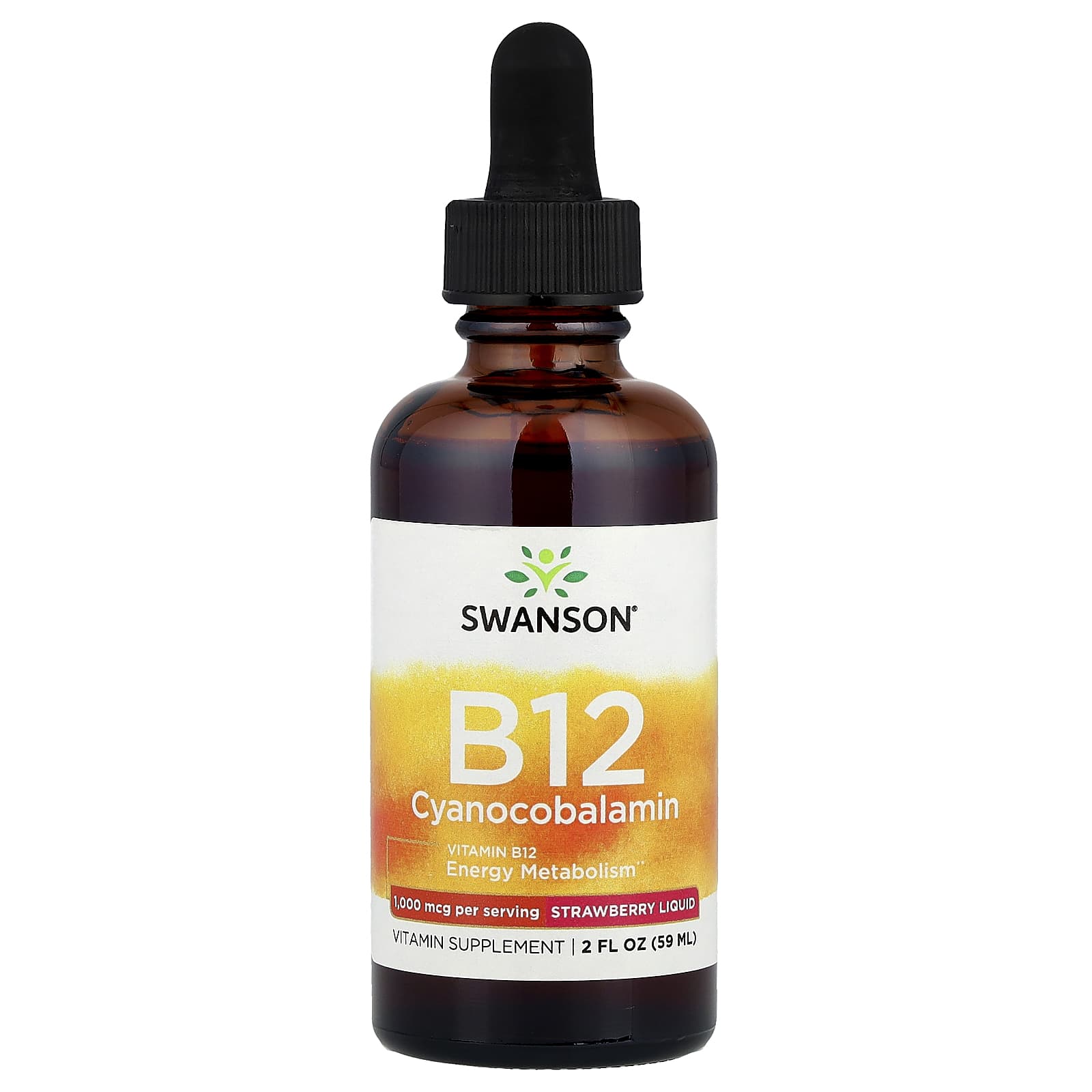 Swanson B12 Cianocobalamina Líquida Morango 59 ml (2 fl oz) – Swanson Suplementos Vitaminas Vitamina B Vitamina B12 (Cobalamina).