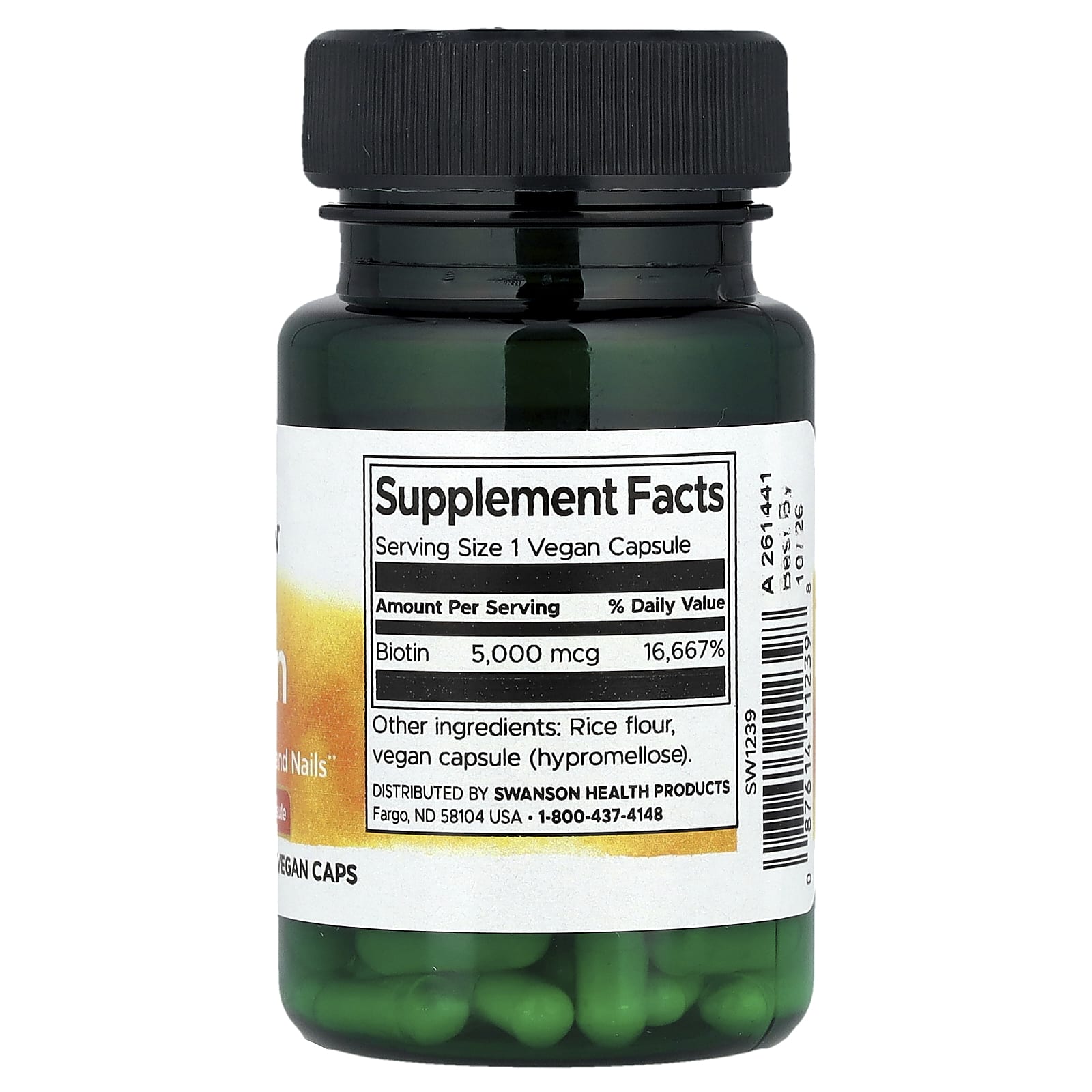 Swanson Biotina 5.000 mcg 30 Cápsulas Veganas – Swanson Suplementos Cabelos, Pele e Unhas Vitamina B7 (Biotina).