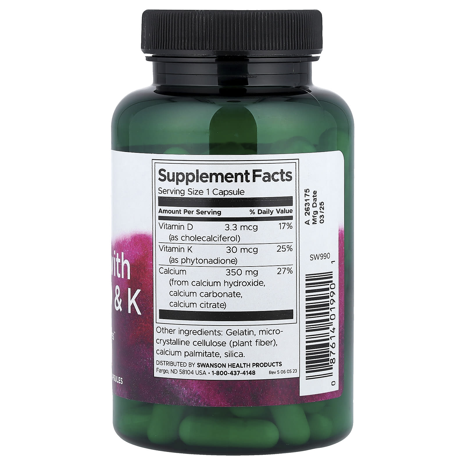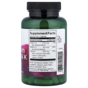 Uma excelente fonte de nutrientes essenciais para a manutenção óssea, o Cálcio da Swanson com Vitaminas D e K fornece nutrição de qualidade a um preço acessível. Elaborado para fornecer aos ossos os nutrientes necessários para mantê-los saudáveis e fortes, o Cálcio com Vitaminas D e K é uma fórmula abrangente que combina três formas de cálcio com o suporte sinérgico das vitaminas D e K. Cada cápsula conveniente contém 350 mg de cálcio de hidróxido de cálcio, carbonato de cálcio e citrato de cálcio — mais 30 mcg de vitamina K e 3,3 mcg (133 UI) de vitamina D.