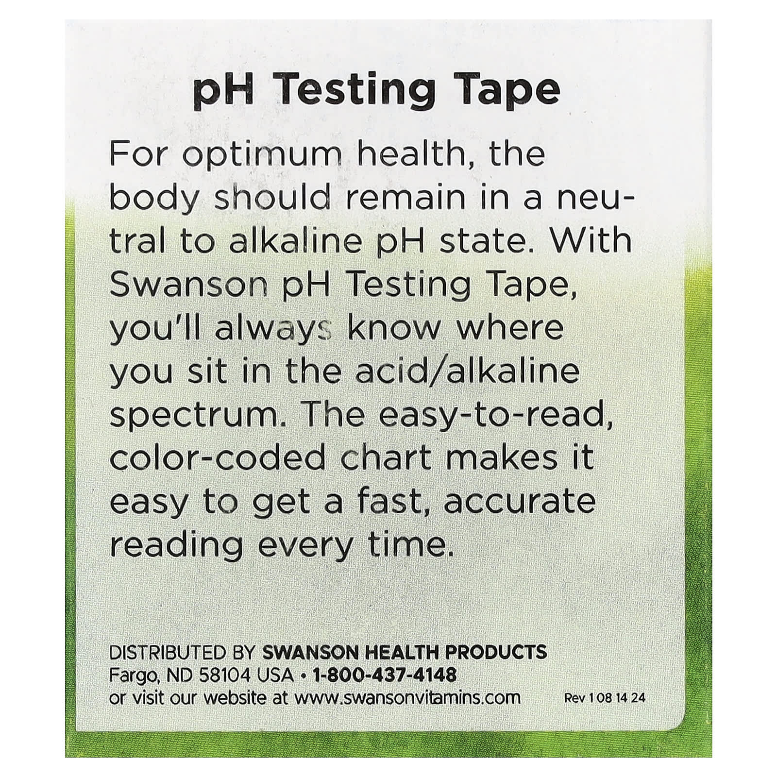Para uma saúde ideal, o corpo deve permanecer em um estado de pH neutro a alcalino. Com a fita de teste de pH da Swanson, você sempre saberá onde está no espectro ácido / alcalino. O gráfico de fácil leitura e codificado por cores facilita a obtenção de uma leitura rápida e precisa todas as vezes.
