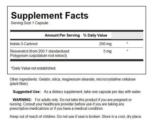 • Proteção celular sem precedentes: Swasons Indole-3-carbinol (I-3-C) combina resveratrol e um fitonutriente exclusivo encontrado em vegetais crucíferos para oferecer saúde e proteção celular. • Fórmula poderosa: fornecendo 200 mg de indole-3-carbinol e 5mg de resveratrol per cápsula, este suplemento de defesa celular é um dos protetores mais poderosos da natureza e promove um ciclo celular saudável com ingredientes naturais. • Instruções de dosagem: Nossos suplementos de bem -estar oferecem soluções diárias para uma mente, corpo e lar aprimorados usando apenas os ingredientes mais puros. Para obter melhores resultados, tome uma cápsula por dia com água. • Nosso compromisso de qualidade: por quase 50 anos, a Swanson entregou produtos de saúde apoiados em ciências em todo o mundo. Cada suplemento de bem-estar é feito em nossas instalações certificadas por GMP, e nosso teste de pureza e potência inclui laboratórios independentes de terceiros. • Garantia de devolução do dinheiro: na Swanson, garantimos que todo produto de saúde seja feito com os nutrientes mais puros e mais frescos. Se você não estiver satisfeito com qualquer produto comprado nos últimos 30 dias, retorne a parte não utilizada para nós para um reembolso total. Color: Marca: Swanson Dimensiones: 0.09 x 0.04 x 0.04mts. Peso del Producto: 0.04 Kilogramos. Peso de Envio: 0.04 Kilogramos. Modelo: SW1007 Garantia do vendedor: 30 dias