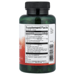 O Óleo de Fígado de Bacalhau Swanson é uma fonte rica em vitaminas A e D. Esta fórmula funciona para reforçar os ossos com vitamina D e melhorar a saúde dos olhos, da pele e do sistema imunológico com vitamina A. Cada cápsula softgel de alta biodisponibilidade fornece 1.250 UI de vitamina A e 135 UI de vitamina D.