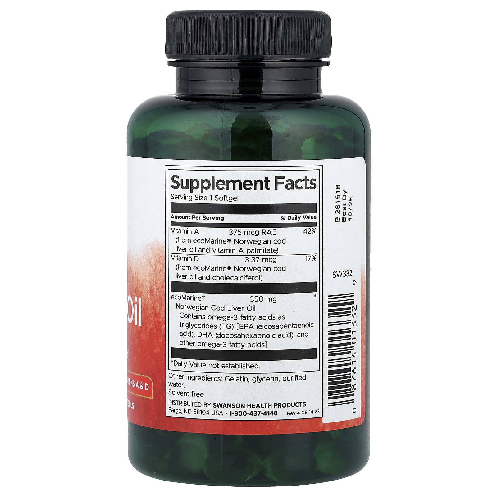 Swanson Óleo de Fígado de Bacalhau Norueguês 350 mg 250 Cápsulas Softgel – Swanson Suplementos Ômegas e Óleos de Peixe (EPA/DHA) Óleo de Fígado de Bacalhau.
