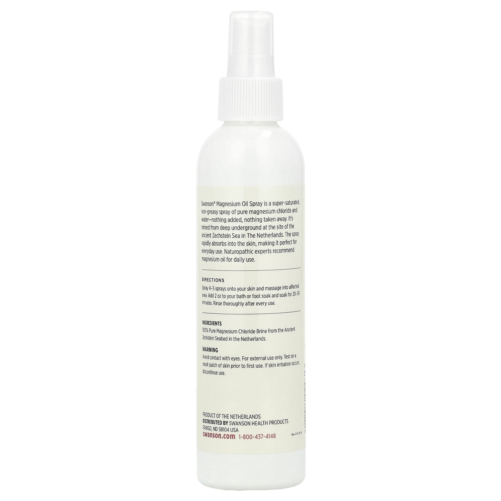 O Spray de Óleo de Magnésio Swanson® é um spray supersaturado e não gorduroso de cloreto de magnésio puro e água – nada adicionado, nada removido. Ele é extraído do subsolo no local do antigo Mar de Zechstein, na Holanda. O spray é rapidamente absorvido pela pele, tornando-o perfeito para o uso diário. Especialistas em naturopatia recomendam óleo de magnésio para uso diário.