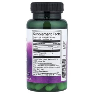 Os Peptídeos de Colágeno Marinho da Swanson contêm MoriKol® clinicamente estudado, um material de origem marinha altamente biodisponível que fornece peptídeos de colágeno com um peso molecular muito baixo e que permite maior absorção. Cada dose de 2 cápsulas fornece 1 grama de colágeno marinho tipo I.