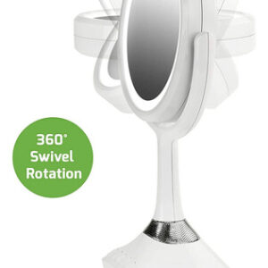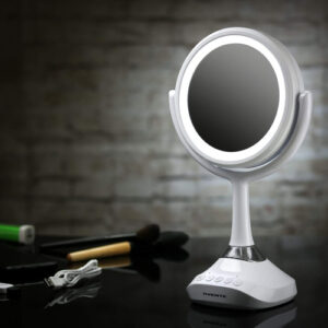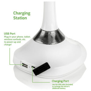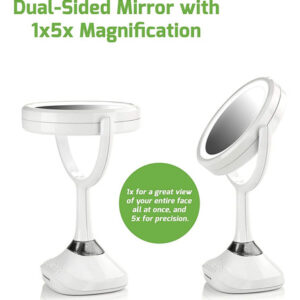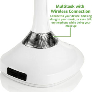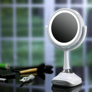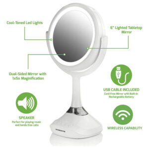 Espelho de maquilhagem iluminado Ovente, tampo de mesa, LED circular de dupla face giratório de 360 graus de 6", lupa 1x 5X com áudio MP3, alto-falante sem fio embutido, recarregável, operado por USB, branco MRT06W1X5X – Dupla face e 5x ampliação – Este espelho de luxo com design giratório de 360 lados apresenta ampliações de 1x e 5x. 1x (visão facial completa) e 5x para ver cada detalhe de perto) – Compatibilidade com alto-falante sem fio embutido e pen drive MP3 Agora você pode ouvir suas músicas, podcasts, audiolivros favoritos ou até mesmo falar ao telefone diretamente pelo espelho enquanto se prepara. – Difuso Anel de luz LED branco – Lâmpadas duradouras e eficientes em termos de energia que simulam a iluminação natural do dia. – Recarregável e sem fio Este espelho é operado por uma bateria recarregável embutida de 2000mAh que pode ser recarregada por um cabo USB (incluído). – Atendimento ao cliente com sede nos EUA: A Ovente garante que o produto estará livre de defeitos de material e fabricação sob condições e uso normais, por 1 ano a partir da data de compra original.