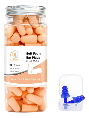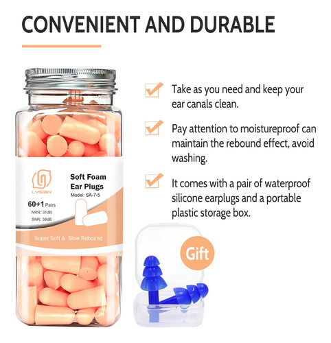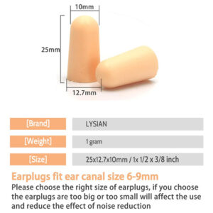 LYSIAN Ultra Soft Skin Color Foam Earplugs 60 Pairs with one pair Resuable Silicone Earplugs and one portable case , 31dB NRR Upto 38dB SNR Ear Plugs, Comfortable Ear Plugs for Hearing Protection, Sleeping, Snoring, Work, Travel and All Loud Events – Non-toxic & Soft Material: The earplugs are made of Super Soft and Non-toxic PU Foam (Latex free and PVC free). Slow Rebound Foam Earplugs will fit your ear canal comfortably. You may not realize youre wearing them. – Great Noise Blocking: 31dB NRR(Noise Reduction Rating) and 38dB SNR(Single Number Rating). They are two different rating systems. They are different because the way they are tested is different. – Multiple Uses: The earplugs are great for Sleeping, Working, Studying, Travel, shooting or any environment you need quiet. – Package Contents: 60 pairs + 1 waterproof silicone ear plugs. It is convenient and easy for you to use for a long time. – One pair reusable silicone ear plugs with one carrying case for gift. Waterproof carrying case is convenient for you to carry earplugs at anywhere.