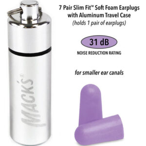 Tampões de ouvido de espuma macia Macks Slim Fit, 7 pares com estojo de viagem. Tampões de ouvido pequenos para dormir, roncar, viajar, fazer shows, fotografar esportes e ferramentas elétricas | Fabricados nos EUA — Tampões de ouvido pequenos — Projetados cerca de 20% menores que os tampões de ouvido de espuma de tamanho padrão da Mack para oferecer o máximo conforto para canais auditivos pequenos ou sensíveis — Máximo conforto — Moldados com espuma de superbaixa pressão, esfolada e cônica, de liberação lenta, fornecendo conforto e higiene inigualáveis para o usuário. Ótimo para dormir de lado. – Estojo de viagem premium, protetor, de alumínio – Pode ser preso ao chaveiro, presilha de cinto ou mochila, para que seus tampões de ouvido fiquem limpos e convenientes quando você precisar deles. – Proteção auditiva – Com uma alta taxa de redução de ruído (NRR) de 31 decibéis, esses protetores de ouvido bloqueadores de ruído são ótimos para dormir, roncar, estudar, usar ferramentas elétricas, fotografar esportes, viajar, eventos barulhentos, etc. – EUA #1 Marca recomendada por médicos — Macks é a marca #1 recomendada por médicos de tampões de ouvido para proteger a audição ou prevenir a perda auditiva. Confie na Macks, a marca em que os médicos confiam.