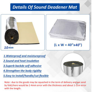 394 mil (10 mm) de amortecimento de som de carro e isolamento térmico Espuma de célula fechada – Amortecedor de som de espuma PE Forte desempenho de isolamento e absorção de som, isolamento térmico, redução do consumo de energia com o forte desempenho do isolamento térmico Forte desempenho autoviscoso – Tamanho do material de amortecimento de som: espessura nominal 394 mils; área de cobertura total de 10,8 pés quadrados; tamanho nominal da folha 40×40 polegadas. faixa de temperatura de trabalho: -40F ~ 300F – Isolamento térmico e vibração Amortecedor: bloqueia efetivamente 98% da transferência de calor radiante. O tapete de amortecimento de som é um material de isolamento muito versátil com excelentes propriedades de barreira térmica que bloqueará o motor, o escapamento e o calor do verão, garantindo que seu veículo permaneça mais frio no verão e mais quente no inverno, tornando sua viagem mais agradável! – O isolamento autoadesivo automotivo é um amortecedor térmico leve à prova d'água com uma formulação de espuma de célula fechada altamente compressível, que absolutamente não absorve umidade e não tem odor – O tapete de amortecimento de som pode ser aplicado em divisórias externas, firewalls, capôs, compartimentos do motor, compartimentos do motor, baús, arcos de roda, painéis de carroceria, pisos de carga e divisórias internas sob o piso do assento. – O material de amortecimento de som vem em tamanho útil folhas que facilitam o processo de corte e instalação e são flexíveis, o que torna é fácil de instalar com ou sem rolo.