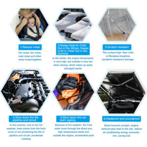 – Diminui o envelhecimento da pintura do carro. Devido ao clima quente, a tampa externa frontal passa pelo sol direto, a alta temperatura interna e fora do motor, envelhecimento acelerado da tinta – mantém o calor no frio fora no inverno, mantém o frio no calor fora do Verão. No inverno, a temperatura do motor é muito alta, mas a parte externa é muito baixa durante a condução, o que facilita a danificação das peças do carro