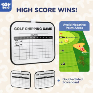 Quatro! Toda a sua família vai adorar as risadas que este jogo de competição de golfe traz. Basta colocar a camiseta no tapete de lascar incluído e atirar até o grande tapete de brincar. As bolas grudam na superfície para marcar sua pontuação. Quanto mais perto você chegar do buraco, mais pontos você ganha! Cuidado com os obstáculos de areia ou água, esses são pontos negativos. O conjunto inclui 20 bolas codificadas por cores para 4 equipes e 6 estacas terrestres para uso externo, 1 bolsa de armazenamento e um placar. (clubes de golfe não estão incluídos). Qualidade premium: feito de tecidos duráveis e pegajosos, o tapete de golfe com cavacos, com estrutura em tecido de forro fino e material lavável, apresenta um putting green realista para o jogador. O tapete pode ser usado no quintal ou dentro de casa. As bolas são sólidas o suficiente para atirar, mas macias o suficiente para não causar danos às paredes ou às luminárias internas. Golf Game & Toss Game: o tapete de golfe pode ser usado não apenas como uma cena de jogo de golfe ou como um jogo interno e externo, mas também como um brinquedo de arremesso pendurado na parede conforme sua conveniência; é fácil de armazenar e portátil, até mesmo para crianças se desenrolarem e configurarem; perfeito para jogos de festa e família: ganhe! Aproveite sua diversão competitiva, cada jogador se reveza para buscar suas fichas e atinge a área marcada de pontuação para obter o máximo de pontos e vitórias. O tapete é colorido com uma meta central e obstáculos. Atire para o centro para obter o maior número de pontos. Apenas tome cuidado com as armadilhas de areia e com a água.. Esses são pontos negativos. – Chipping Mat & Sticky Balls: O conjunto de tapetes de golfe Chipping é um ótimo jogo de golfe interno e externo para toda a família, adequado para iniciantes e jogadores habilidosos praticarem golfe. Este divertido conjunto de golfe inclui um grande tapete de golfe lascado (cerca de 6 pés de comprimento e 5 pés de largura), 20 bolas adesivas, 6 estacas no chão, um cartão de pontuação e uma bolsa de armazenamento. (taco de golfe não incluído) – Diversão em família e festas: ganhe! Cada jogador joga sua bola no tatame tentando acertar a área marcada para conseguir o maior número de pontos. O tapete é colorido com uma meta central e obstáculos. Atire para o centro para obter o maior número de pontos. Apenas tome cuidado com as armadilhas de areia e com a água.. Esses são pontos negativos. – Dois jogos em um: o tapete de golfe pode ser usado não apenas como cenário de jogo de golfe ou como jogo interno e externo, mas também como brinquedo de arremesso pendurado na parede. É fácil de armazenar e portátil até mesmo para crianças desenrolarem para montar. – Qualidade premium: feito de tecidos duráveis e pegajosos, com tecido fino e material lavável. O tapete pode ser usado no quintal ou dentro de casa. As bolas são sólidas o suficiente para atirar, mas macias o suficiente para não causar danos às paredes ou às luminárias internas. – TOY Life Promise: Temos muito orgulho em oferecer brinquedos seguros, educativos, interativos e, o mais importante, divertidos! A satisfação do seu produto é fundamental para o nosso negócio. Se você tiver alguma dúvida ou preocupação em relação à sua compra, entre em contato conosco diretamente pelo sistema de mensagens da Amazon para que possamos ajudá-lo. Obrigado por sua compra!
