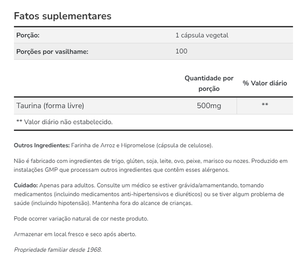 Kit Taurina Taurine Now Foods 500mg 100 Caps + Porta Cápsulas Destaque Chave: A Taurina Taurine 500mg da Now Foods é um suplemento que fornece taurina, um aminoácido importante para diversas funções corporais. Este suplemento é ideal para aqueles que buscam apoiar suas atividades diárias com um nutriente essencial. Formato Eficiente: Apresentado em cápsulas vegetarianas, a Taurina Taurine da Now Foods oferece uma maneira prática e conveniente de incluir esse aminoácido na sua dieta. As cápsulas são fáceis de engolir e perfeitas para a inclusão em qualquer rotina. Qualidade Importada com Disponibilidade: Este produto é importado, garantindo alta qualidade e padrões rigorosos de fabricação. Além disso, está disponível para pronta entrega, facilitando a aquisição e início do uso. Porta Cápsulas com Duas Repartições: O kit também inclui um porta-cápsulas prático, dividido em duas seções internas. Isso permite uma organização eficaz e separada de diferentes tipos de cápsulas ou pílulas. Composição Segura e Confiável: Cada cápsula contém 500mg de taurina pura, sem a adição de ingredientes artificiais. O produto é adequado para vegetarianos e livre de conservantes, garantindo um suplemento puro e eficaz. VALIDADE LONGA