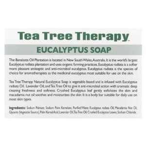 O Sabonete de Eucalipto Natural da Tea Tree Therapy é à base de vegetais e é infundido com Óleo de Eucalyptus radiata, Óleo de Lavanda e Óleo de Melaleuca para obter ação antimicrobiana com frescor e suavidade de limpeza profunda aromática. A folha de Eucalipto triturada esfolia suavemente a pele e o óleo de macadâmia acalma e hidrata a pele. É um sabonete corporal adequado para uso diário na maioria dos tipos de pele.