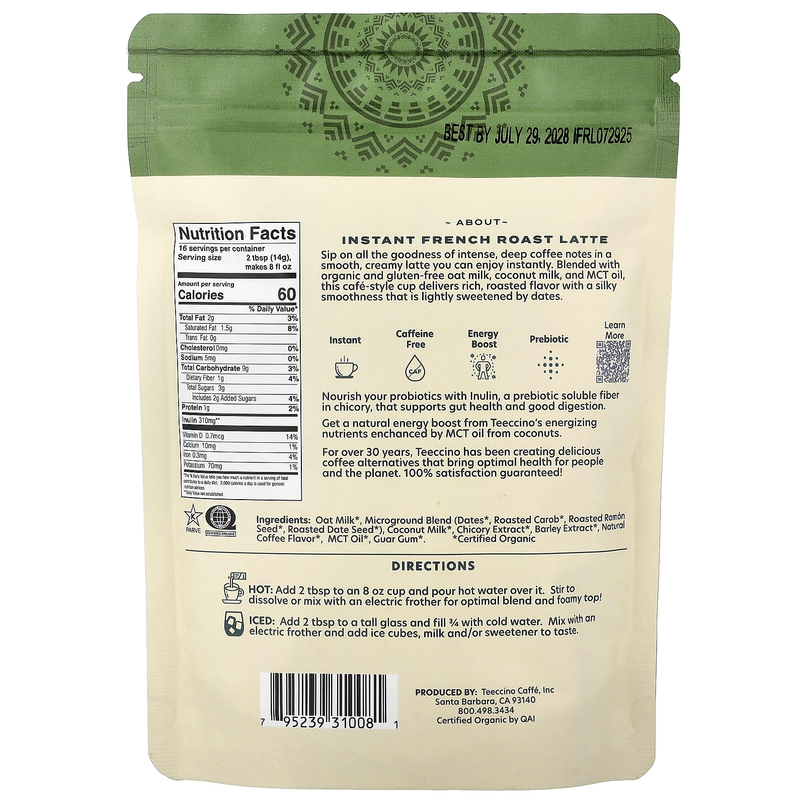 Teeccino Latte de Ervas Instantâneo Torra Francesa Torra Escura Sem Cafeína 224 g (79 oz) – Teeccino Alimentos Chás e bebidas Coffee Café instantâneo Café de Ervas e Cogumelos.