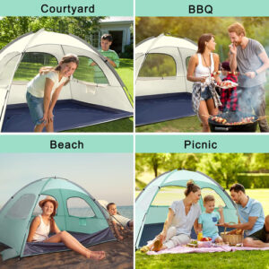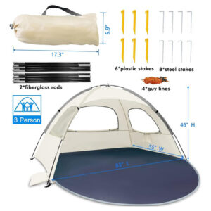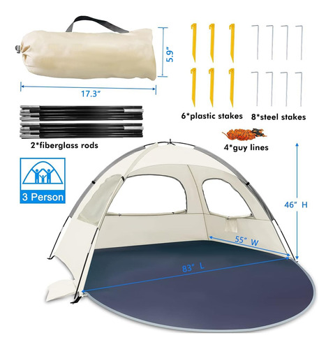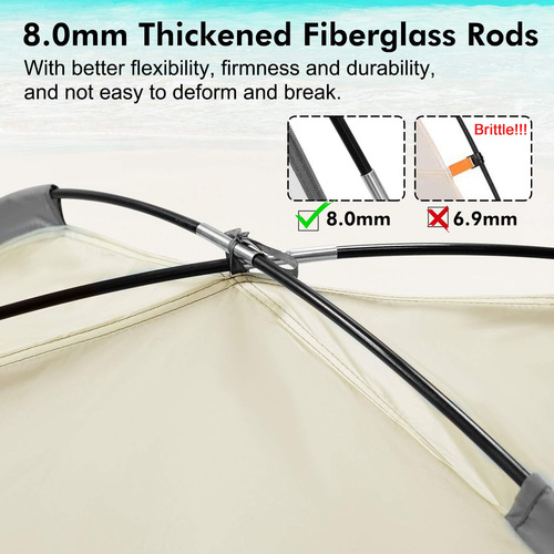 Abrigo solar portátil anti-UV WhiteFang Beach Tent para 3 pessoas, piso extensível com 3 janelas de malha ventilada, além de bolsa de transporte, estacas e linhas de proteção (respiração do bebê) – varetas de fibra de vidro espessadas de 8,0 mm: aumentamos a espessura das hastes de fibra de vidro para 8,0 mm para torná-las mais flexíveis, resistentes e duráveis. Pode suportar a barraca de forma mais estável e manter a forma mesmo após um longo período de uso. – Proteção UPF 50+ e excelente ventilação: nossa barraca de praia é feita de poliéster revestido com material premium à prova de sol de 210 t, pode bloquear efetivamente o calor e 98% dos raios UV nocivos. 3 janelas de malha enrolável super grandes aumentam o fluxo de ar e reduzem a temperatura. Isso ajuda a manter o calor escaldante do verão longe de sua família e permite que você aproveite a brisa oceânica em um espaço confortável. – Estabilidade e à prova de vento: boas varas são a chave para manter uma barraca estável e à prova de vento, por isso usamos as hastes de fibra de vidro de 8 mm. E nossa barraca de praia também está equipada com 3 sacos de areia, 8 estacas de aço, 6 estacas de areia e linhas de apoio. A combinação de soquete e estaca pode fazer com que a barraca se agarre com mais firmeza e resista ao vento forte de forma mais eficaz. – Zíper omnidirecional para maior privacidade: nossa barraca de praia usa design de zíper omnidirecional. Ele permite que você abra e feche o tapete por dentro, por fora e por ambos os lados. É muito conveniente entrar e sair. O piso frontal estendido oferece espaço extra para mais atividades, que podem ser fechadas quando você precisar de mais espaço privado ou estiver longe da barraca. – Leve e portátil: nossa barraca de praia é leve, portátil e fácil de dobrar com uma bolsa de transporte compacta. O tamanho pequeno facilita a viagem e o armazenamento. É conveniente transportar para qualquer lugar que você quiser. Basta fazer uma viagem à praia com sua família! (Dicas: é recomendável contar com a ajuda de outra pessoa para facilitar a montagem e a configuração)