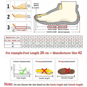 Se você está confuso sobre o tamanho, escolha o tamanho adequado ao comprimento do seu pé: se seus pés forem mais grossos ou mais selvagens, escolha um tamanho maior. A