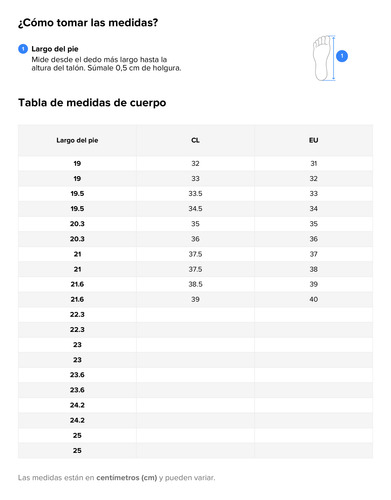 EUR31=19,5mx=31chile=29Brasil EUR32=20mx=32chile=30Brasil EUR33=21mx=33chile=31Brasil EUR34=21,5mx=34=3mx=34=3mx=34e=32 Brasil EUR35=22mx=35Chile=33 Brasil EUR36=23mx=36Chile=34Brasil EUR37=23,5MX=37Chile=35Brasil EUR38EUR = 24,5 MX=38 Chile = 36 Brasil EUR 39 = 25 MX= 38,5 Chile = 37 Brasil EUR 40 = 25,5 MX= 39 Chile = 38 Brasil
