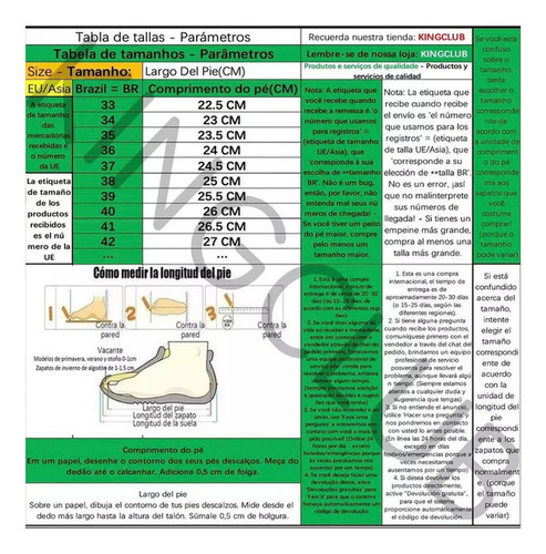 Certifique-se de escolher o seu tamanho de acordo com a tabela de dados de tamanho recomendada em nossos anúncios – para evitar erros de tamanho. (Se você está confuso com os tamanhos brasileiros, também pode escolher de acordo com o comprimento do pé: CM)