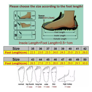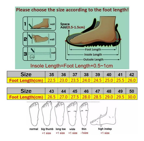 Para escolher o calçado mais confortável, recomendamos que escolha o tamanho numérico correspondente estritamente em função do comprimento do pé. (Observe que o comprimento do pé não é o comprimento do sapato), se seus pés forem mais gordos ou mais largos, recomendamos escolher um tamanho maior, entre em contato conosco se não tiver certeza.