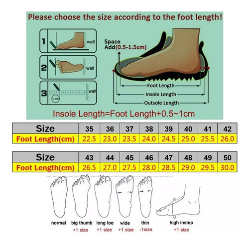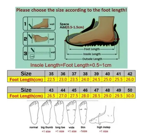 Para escolher o calçado mais confortável, recomendamos que escolha o tamanho numérico correspondente estritamente em função do comprimento do pé. (Observe que o comprimento do pé não é o comprimento do sapato), se seus pés forem mais gordos ou mais largos, recomendamos escolher um tamanho maior, entre em contato conosco se não tiver certeza.