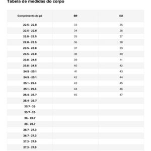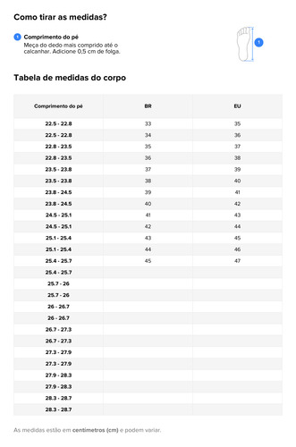 Nota: Se você tem pés grossos ou largos, é recomendável comprar um tamanho maior.