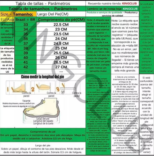 ***** NOTA: Se você se confundir em tamanhos (pode ser diferente do tamanho do seu país), escolha o tamanho de acordo com o comprimento do seu pé! ! ! !