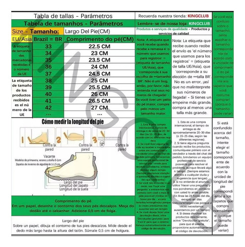 ***** NOTA: Se você se confundir em tamanhos (pode ser diferente do tamanho do seu país), escolha o tamanho de acordo com o comprimento do seu pé! ! ! !
