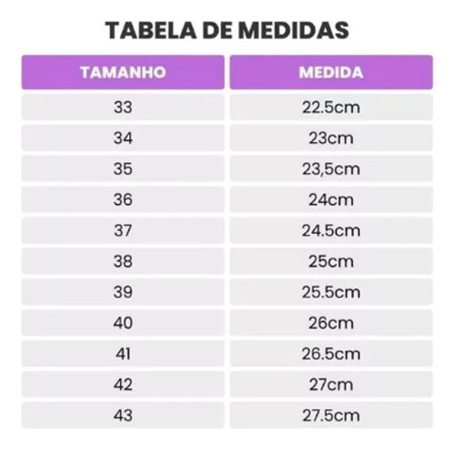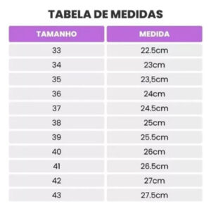 39BR = 41 UE = 41 Brasil, = comprimento da palmilha 25,5 cm