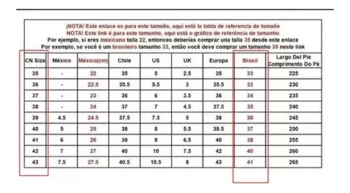 EU35 = talla mexicana 2,5 = MX22,5 = talla brasilea 33, longitud del pie 22,5 cm;