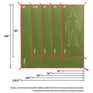 Pegada ultraleve da barraca – Ultraleve e compacta: tamanho 80" x 80", pesando apenas 0,7 libras, feita de material de alta densidade, mantendo seu equipamento o mais leve possível. – Proteção à prova d'água: feita de tecido de poliéster impermeável 190T PU3000 mm, mantém você e seu equipamento secos mesmo em condições úmidas (protegendo o chão da barraca da umidade e evitando que a água penetre). – Construção durável: usando alta resistência ilhós, tiras estendidas e espessadas e poliéster ripstop o tornam durável e capaz de suportar terrenos acidentados e potenciais perigos como pedras e paus. – Uso versátil: essa área não se limita apenas a acampar em barracas. Também pode ser usado como lona para acampar em redes, tapete de praia ou cobertura de solo de uso geral. Sua versatilidade o torna uma adição valiosa a qualquer aventura ao ar livre. – Ajuste perfeito: disponível em 5 tamanhos, 33" x 80"/56" x 80"/80" x 80"/104" x 80"/116,5” x 104", para combinar com diferentes dimensões de tenda ou rede.