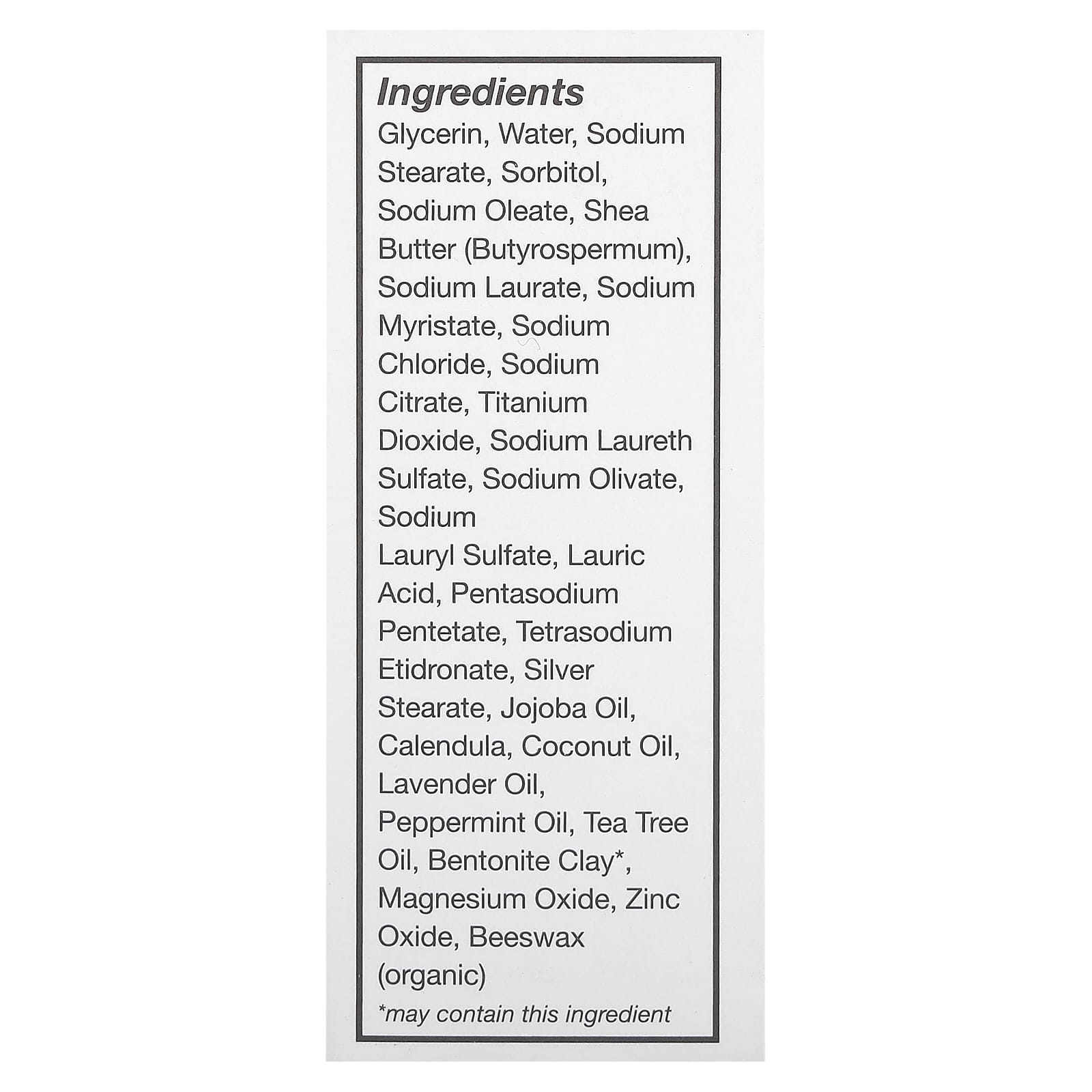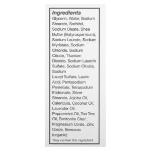 Glicerina, água, estearato de sódio, sorbitol, oleato de sódio, manteiga de karité (butyrospermum), sodium laurate, miristato de sódio, cloreto de sódio, citrato de sódio, dióxido de titânio, lauriletersulfato de sódio, sodium olivate, laurilsulfato de sódio, ácido láurico, pentasodium pentetate, tetrasodium etidronate, estearato de prata, óleo de jojoba, calêndula, óleo de coco, óleo de lavanda, óleo de hortelã-pimenta, óleo de melaleuca, argila de bentonita*, óxido de magnésio, óxido de zinco, cera de abelha (orgânica).