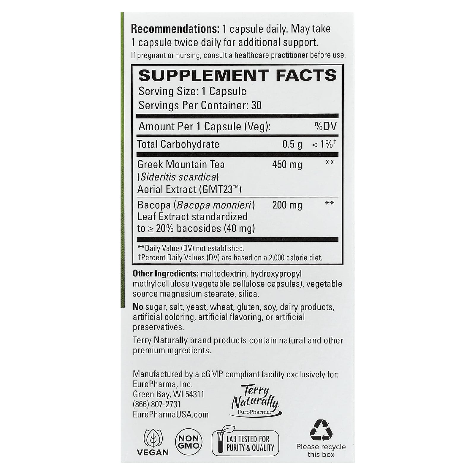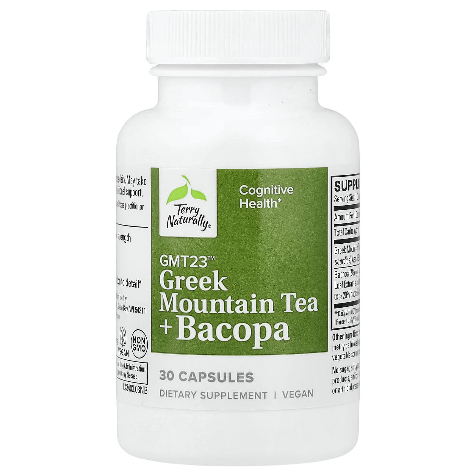 Terry Naturally Chá da Montanha Grego + Bacopa 30 Cápsulas – Terry Naturally Suplementos Ervas Adaptógenos Bacopa.