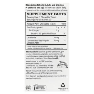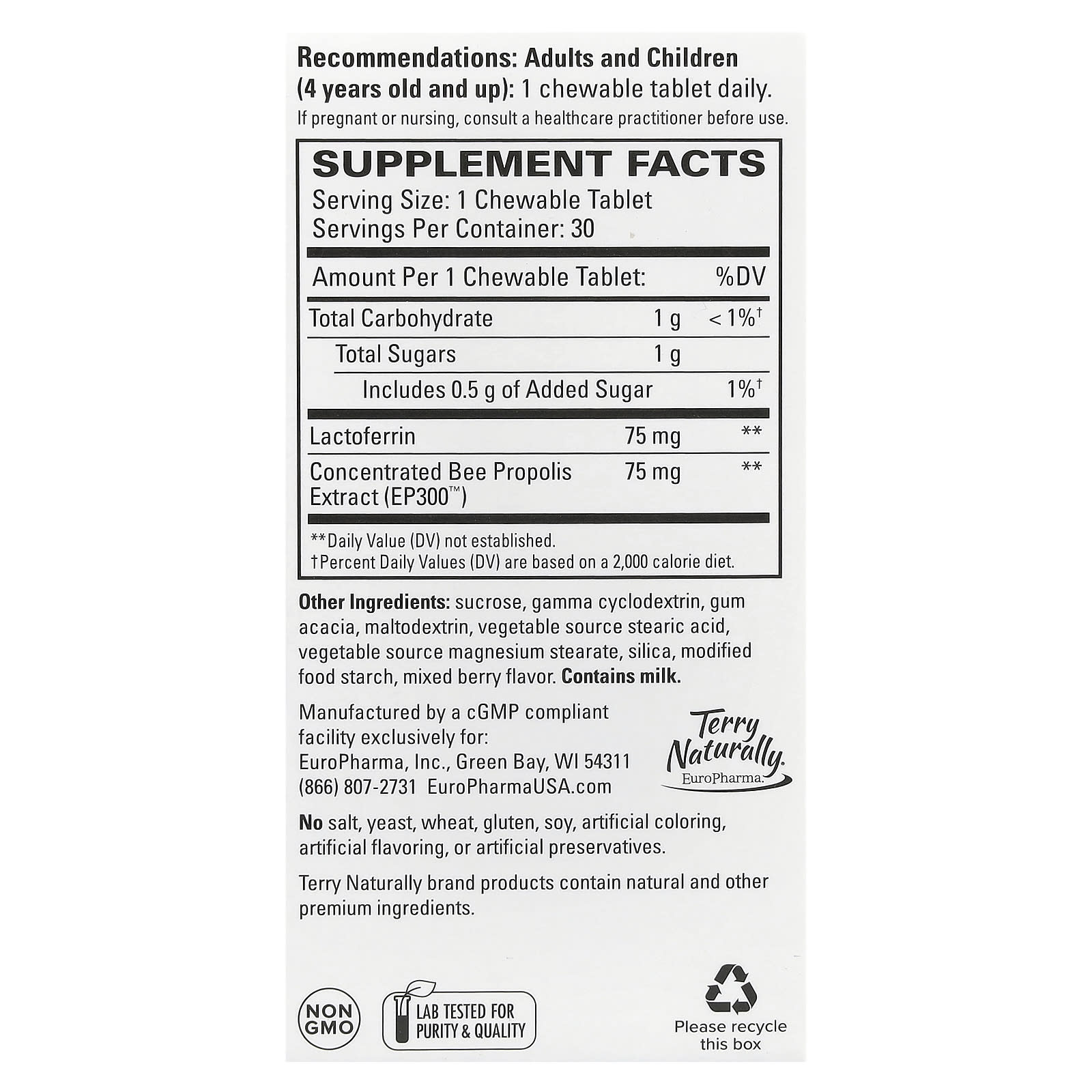 Terry Naturally Lactoferrina com Extrato de Própolis Frutos Silvestres Mistos 30 Comprimidos Mastigáveis – Terry Naturally Cuidados Pessoais Armário do Banheiro Dor e Febre Alívio da Dor.