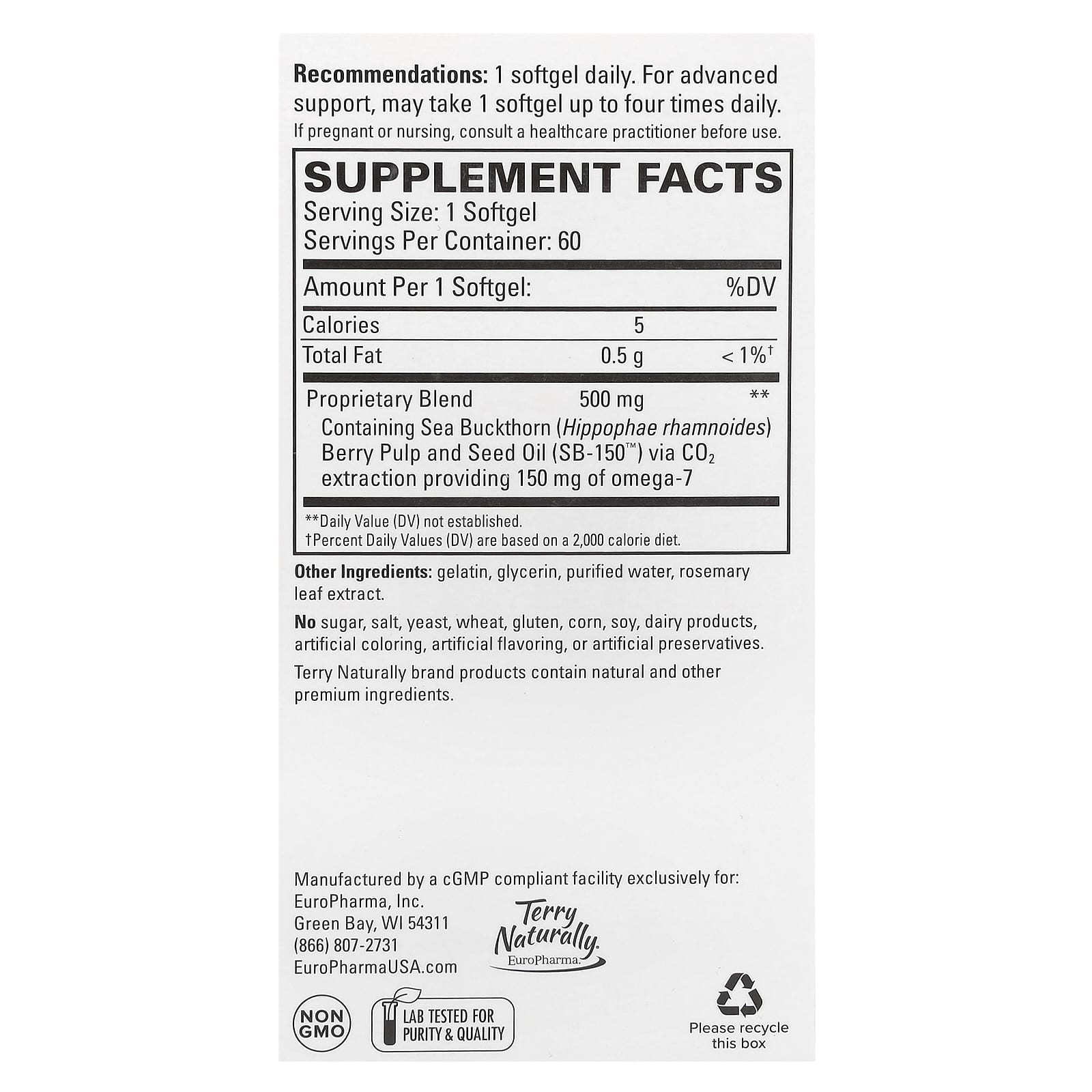 Terry Naturally Ômega-7 60 Cápsulas Softgel – Terry Naturally Suplementos Ômegas e Óleos de Peixe (EPA/DHA) Ômega 7.