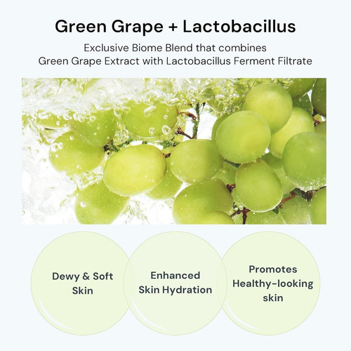 mistura exclusiva de extrato de uva verde e fermento de Lactobacillus melhora a hidratação e a saúde geral da pele.