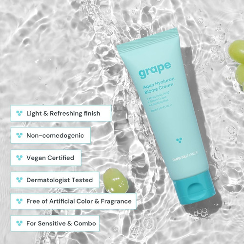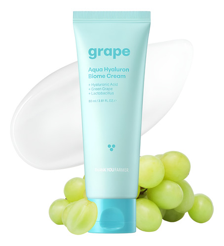 THANKYOU FARMER Grape Aqua Hyaluron Biome Cream, 10 tipos de ácido hialurônico, pele não comedogênica, suave e radiante, fermento de lactobacilo, hidratante coreano para pele oleosa, hidratante de 80 ml com 10 tipos de ácido hialurônico que fornece hidratação profunda e revitaliza a pele, deixando-a macia, fresca e radiante. Sua fórmula de gel leve é absorvida rapidamente sem obstruir os poros, ideal para uso diário e adequada para todos os tipos de pele. A mistura exclusiva Biome combina extrato de uva verde com fermento de Lactobacillus para melhorar a hidratação, promover uma pele saudável e equilibrada e proporcionar uma tez visivelmente renovada. Sem perfume e vegano, este creme é suave até mesmo nas peles mais sensíveis.