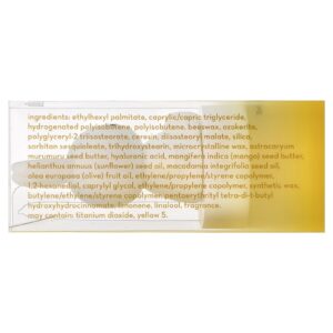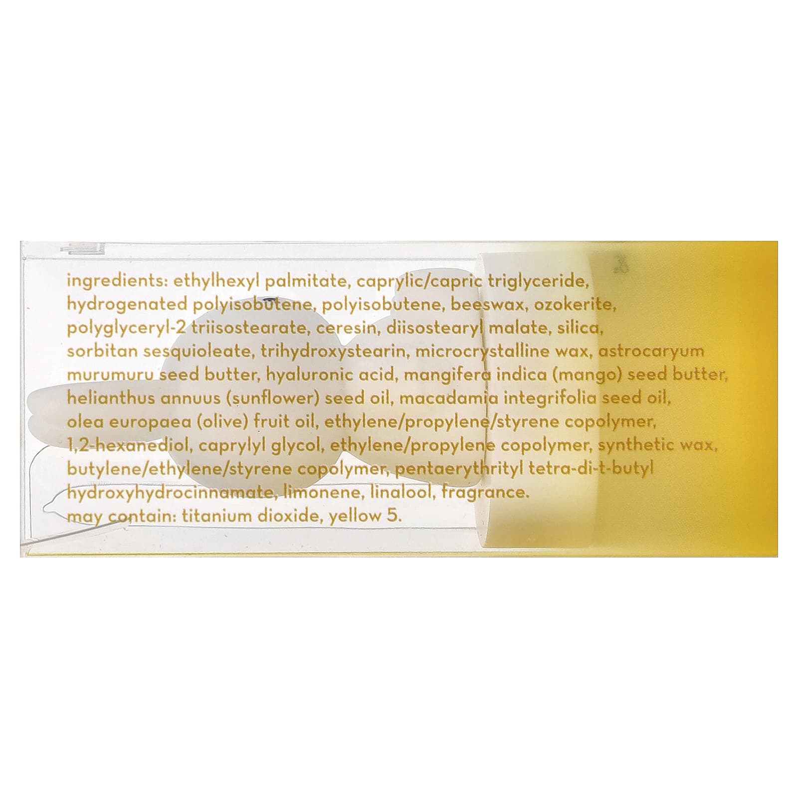 Ethylhexyl palmitate, caprylic/capric triglyceride, poliisobuteno hidrogenado, poli-isobutileno, cera de abelha, ozocerita, polyglyceryl-2 triisostearate, ceresina, diisostearyl malate, sílica, sesquioleato de sorbitana, trihydroxystearin, cera microcristalina, manteiga da semente de Murumuru astrocaryum, ácido hialurônico, manteiga da semente de Mangifera indica (manga), óleo da semente de Helianthus annuus (girassol), óleo da semente de Macadamia integrifolia, óleo da fruta de Olea europaea (azeitona), ethylene/propylene/styrene copolymer, 1,2-hexanediol, caprylyl glycol, copolímero de etileno/propileno, cera sintética, copolímero de butileno/etileno/estireno, pentaerythrityl tetra-di-t-butyl hydroxyhydrocinnamate, limoneno, linalol, fragrância. Pode conter: dióxido de titânio, amarelo 5.