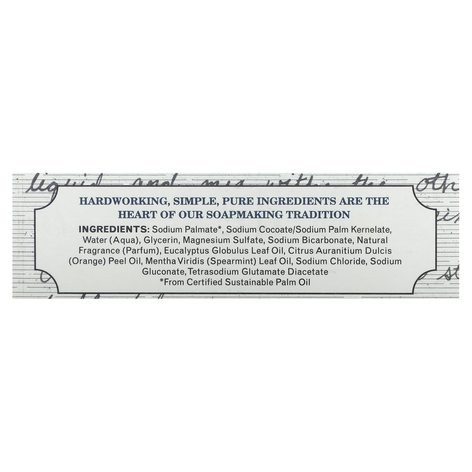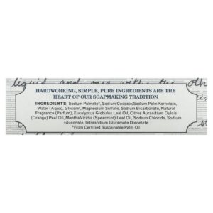 Palmato de sódio *, cocoato de sódio / palmiste de sódio, água (aqua), glicerina, sulfato de magnésio, bicarbonato de sódio, fragrância natural (parfum), óleo da folha de Eucalyptus globulus, óleo da casca de Citrus aurantium dulcis (laranja), óleo da folha de Mentha viridis (hortelã), cloreto de sódio, gliconato de sódio, tetrasodium glutamate diacetate