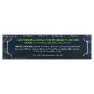 Sodium palmate*, cocoato de sódio / palma / kernelato de sódio, água (aqua), glicerina, alcatrão da madeira de Pinus sylvestris, cloreto de sódio, gliconato de sódio