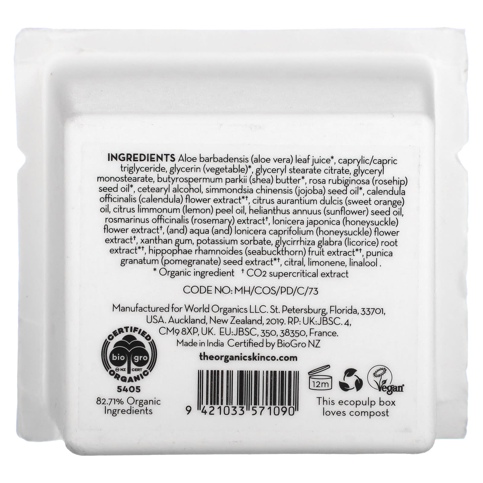Suco da folha de Aloe barbadensis (babosa)*, caprylic/capric triglyceride, glicerina (vegetal) *, citrato de monoestearato de glicerila, glycerol monostearate, manteiga de Butyrospermum parkii (karité)*, óleo da semente de rosa rubiginosa (rosa mosqueta) *, álcool cetoestearílico, óleo da semente de Simmondsia chinensis (jojoba)*, extrato da flor de calêndula officinalis (calêndula) * †, óleo de Citrus aurantium dulcis (laranja doce), óleo da casca de limão cítrico (limão), óleo da semente de Helianthus annuus (girassol), extrato de Rosmarinus officinalis (alecrim) †, extrato da flor de Lonicera japonica (madressilva) †, (e) extrato da flor de aqua (e) lonicera caprifolium (madressilva) †, goma xantana, sorbato de potássio, extrato da raiz de glycirrhiza glabra (alcaçuz) * †, extrato da fruta de hippophae rhamnoides (espinheiro) * †, extrato da semente de punica granatum (romã) * †, citral, limoneno, linalol.