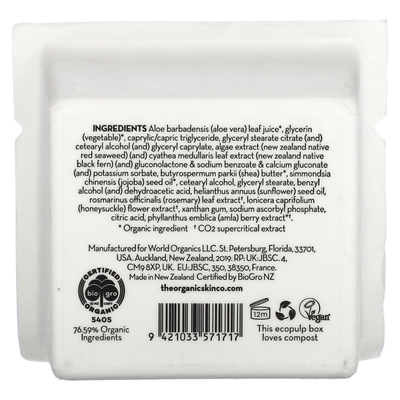 Suco da folha de Aloe barbadensis (babosa)*, glicerina (vegetal) *, caprylic/capric triglyceride, citrato de estearato de glicerila (e) álcool cetearílico (e) caprilato de glicerila, extrato de algas (alga nativa da Nova Zelândia) (e) extrato da folha de Cyathea medullaris (samambaia negra nativa da Nova Zelândia) (e) gluconolactona e amp; benzoato de sódio & amp; gluconato de cálcio (e) sorbato de potássio, manteiga de Butyrospermum parkii (karité)*, óleo da semente de Simmondsia chinensis (jojoba)*, álcool cetoestearílico, monoestearato de glicerila, álcool benzílico (e) ácido desidroacético, óleo da semente de Helianthus annuus (girassol), extrato da folha de rosmarinus officinalis (alecrim) †, extrato da flor de Lonicera caprifolium (madressilva) †, goma xantana, sodium ascorbyl phosphate, ácido cítrico, extrato da baga de Phyllanthus emblica (amla) * †.