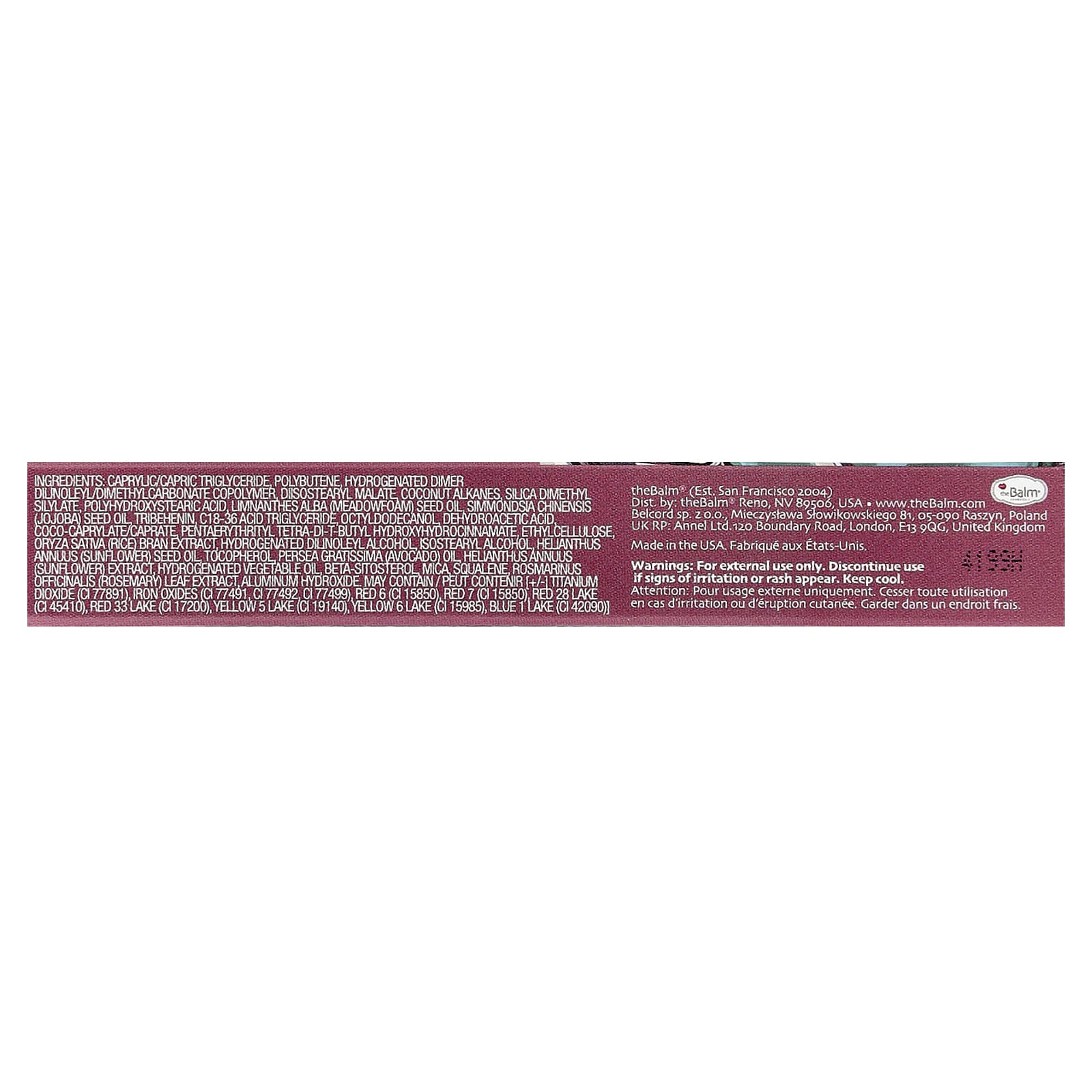 Caprylic/capric triglyceride, polybutene, dímero hidrogenado dilinoleil/copolímero de dimetilcarbonato, diisostearyl malate, alcanos de coco, silica dimethyl silylate, ácido polihidroxiesteárico, óleo da semente de Limnanthes alba (meadowfoam), óleo da semente de Simmondsia chinensis (jojoba), tribohenin, c18-36 acid triglyceride, octildodecanol, ácido dehidroacetico, coco-caprylate/caprate, pentaerythrityl tetra-di-t-butyl hydroxyhydrocinnamate, etilcelulose, extrato do farelo de Oryza sativa (arroz), álcool dilinoleico hidrogenado, álcool estearílico, óleo da semente de Helianthus annuus (girassol), tocoferol, óleo de Persea gratissima (abacate), extrato de Helianthus annuus (girassol), óleo vegetal hidrogenado, betasitosterol, mica, esqualeno, extrato da folha de Rosmarinus officinalis (alecrim), hidróxido de alumínio. pode conter dióxido de titânio / peut contenir [+/-] (CI 77891), óxidos de ferro (CI 77491, CI 77492, CI 77499), vermelho rubi (CI 15850), vermelho 7 (CI 15850), vermelho 28 laca de alumínio (CI 45410), vermelho 33 laca de alumínio (CI 17200), tartrazina laca de alumínio (CI 19140), amarelo crepúsculo laca de alumínio (CI 15985), azul brilhante laca de alumínio (CI 42090)].