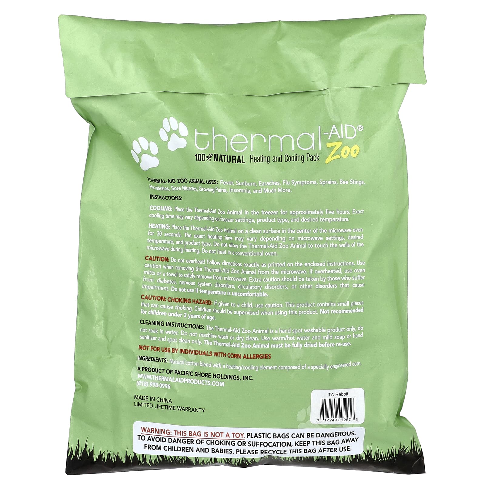 Aquecimento: Coloque o Zoo Animal com Auxílio Térmico em uma superfície limpa no centro do forno de micro-ondas por 30 segundos. O tempo exato de aquecimento pode variar dependendo das configurações de micro-ondas, da temperatura desejada e do tipo de produto. Não permita que o Zoo Animal com Auxílio Térmico toque nas paredes do micro-ondas durante o aquecimento. Não aqueça em um forno convencional.