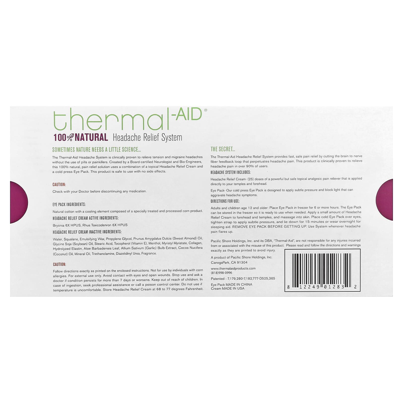 O Sistema Térmico para Dor de Cabeça é clinicamente comprovado por aliviar dores de cabeça tensionais e enxaqueca sem o uso de comprimidos ou analgésicos. Criada por um Neurologista e Bioengenheiros certificados pelo Conselho de Medicina, esta solução de alívio da dor 100% natural usa uma combinação de um Creme para Alívio da Dor de Cabeça tópico e uma Máscara para a Área dos Olhos prensada a frio. Este produto é seguro para uso e sem efeitos colaterais.