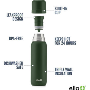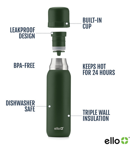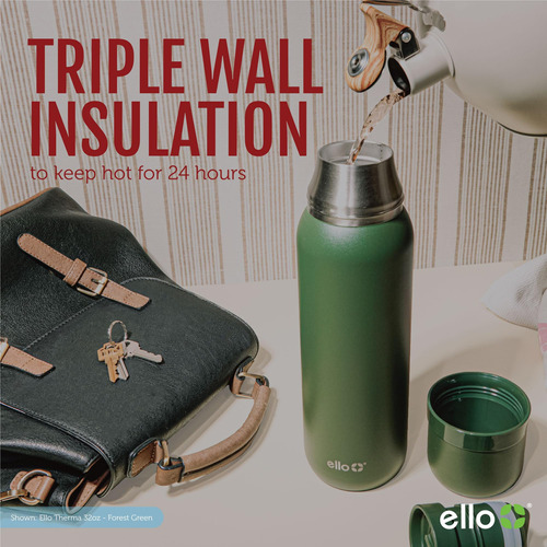 Garrafa térmica de aço inoxidável isolada Ello Therma de 32 onças para bebidas quentes e frias com tampa à prova de vazamentos e copo embutido, isolamento de parede tripla, quente 24 horas, perfeita para café, chá, lavável na máquina de lavar louça, verde — ISOLAMENTO TRIPLO DE PAREDE: Feita com aço inoxidável isolado a vácuo de parede tripla, nossa garrafa térmica mantém bebidas quentes por até 24 horas e bebidas frias refrigeradas por 30 horas. Fortificada com forro de cobre, esta garrafa térmica está pronta para uma vida inteira de aventura. – Tampa à prova de vazamentos: projetada para conveniência e segurança, a Therma possui uma tampa deslizante à prova de vazamentos que permite que você aproveite sua bebida diretamente da garrafa térmica ou do copo integrado. Ideal para viagens rodoviárias e aventuras ao ar livre, você pode guardar Therma em sua mochila sem se preocupar com derramamentos. – Copo embutido: a tampa versátil funciona como um copo funcional de 7,7 onças. Basta desparafusar a tampa para transformá-la em uma caneca adequada à bebida de sua escolha: chá quente, café ou até mesmo uma garrafa cheia de vinho. – TAMPA DA MÁQUINA DE LAVAR LOUÇA: Embora seja recomendável lavar o corpo à mão para uma longevidade ideal, sinta-se à vontade para jogá-la na prateleira superior da máquina de lavar louça, se preferir. A tampa deslizante pode ser removida para uma limpeza completa de todos os cantos e recantos. A tampa deslizante é removível para facilitar a limpeza e entrar em todos os cantos e recantos. Todas as peças são livres de BPA. — PRESENTE PERFEITO: com uma variedade de cores elegantes e contemporâneas para escolher, o Therma é o presente ideal para o ávido viajante ou campista de sua vida, combinando praticidade com design elegante para qualquer aventura espontânea.
